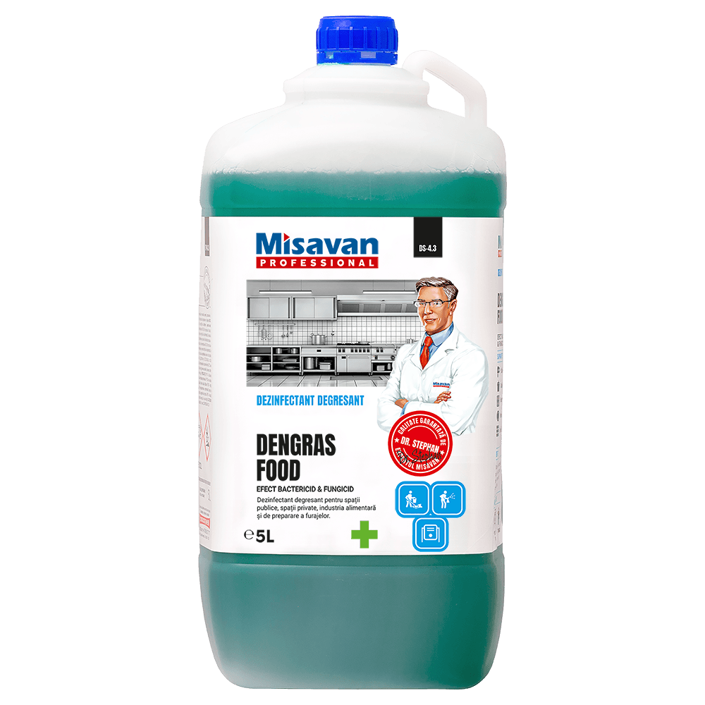 Este un produs cu dubla actiune, care in tiul stationarii pe suprafata actioneaza atat ca degresant cat si ca dezinfectant . Actiunea sa degresanta, practic elimina o operatiune premergatoare dezinfectiei si anume degresarea cu un alt produs. Acest lucru face din produsul Dengras food un produs versatil, coetitiv si usor de utilizat.
